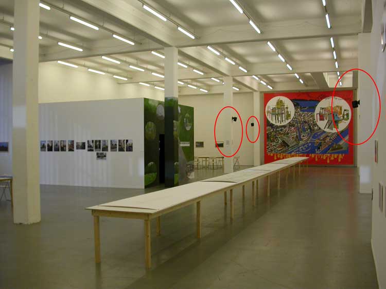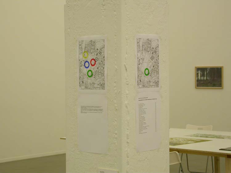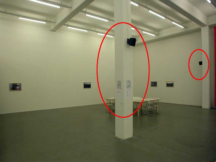zu Tag- und Nachtzeiten aufgenommen. Diese gesammelten Geräusche eines Ortes wurden jeweils über einen Lautsprecher in der Ausstellung wiedergegeben. |
