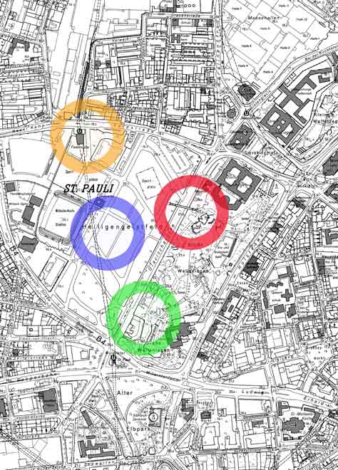 Der erste um die U-Bahn Station Feldstraße (gelb), der zweite um die Fußgängerbrücke über die Glacischaussee (rot), der dritte um die Domwache (blau)