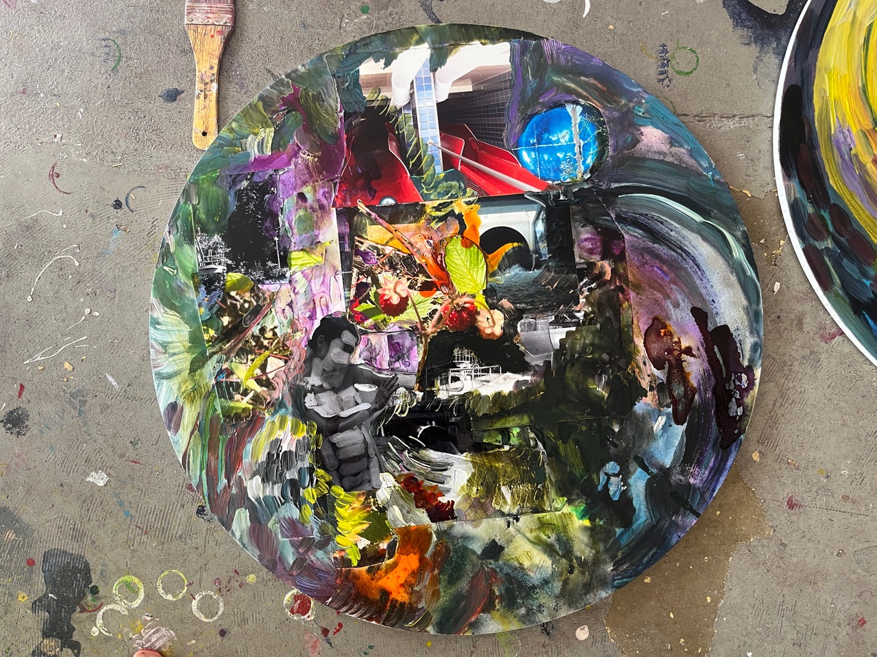 - "Straßenlaterne Alpamareparkplatz" 80 cm Durchmesser, Tusche und Acryl auf Leinwand, 2025 >> 3000 €